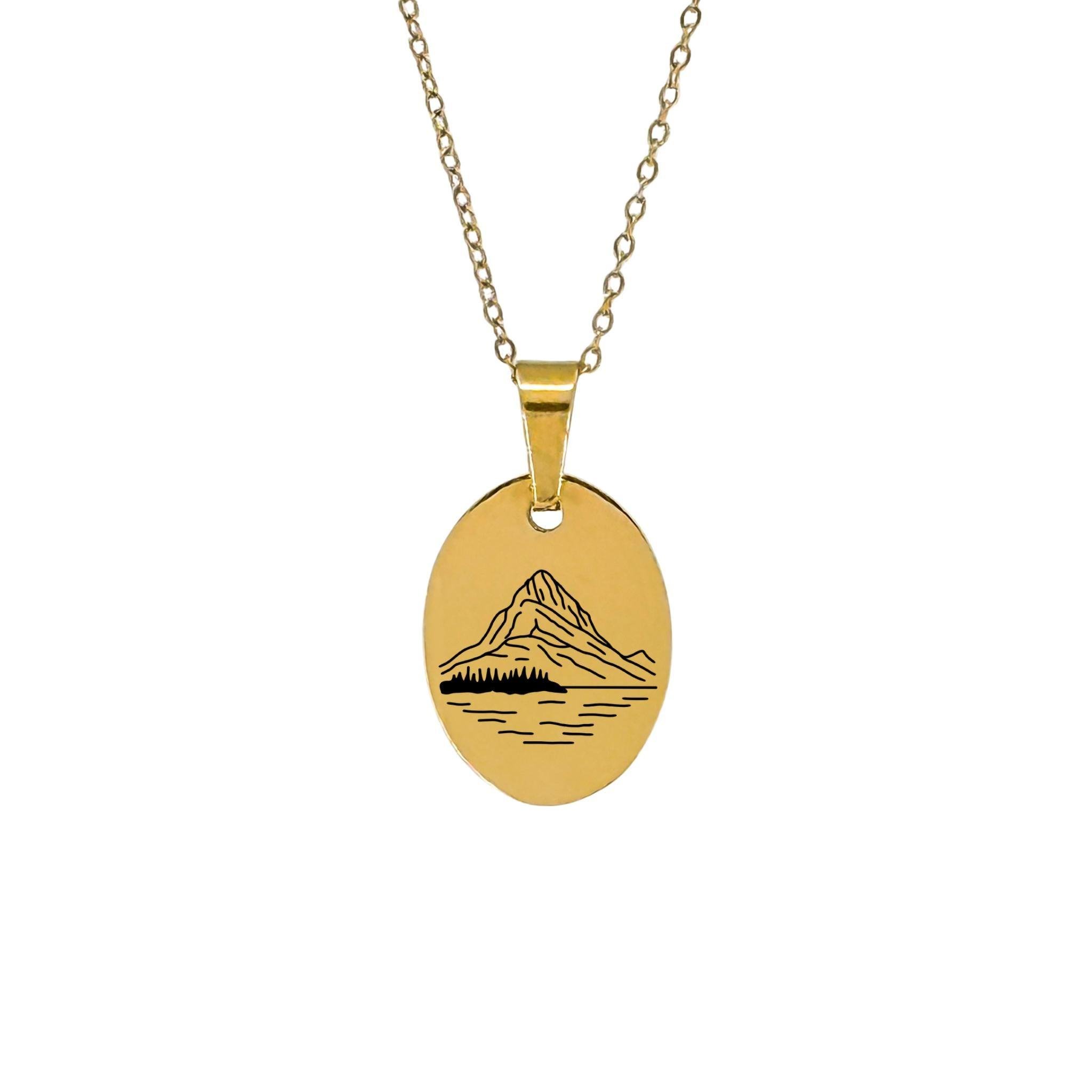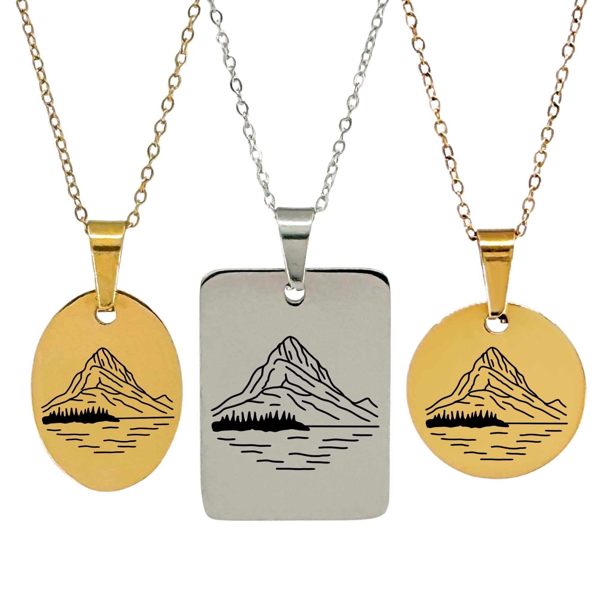 A minimalist necklace engraved with the towering face of Mount Grinnell rising above Swiftcurrent Lake, capturing the raw grandeur and reflection-perfect calm of Glacier’s alpine heart.